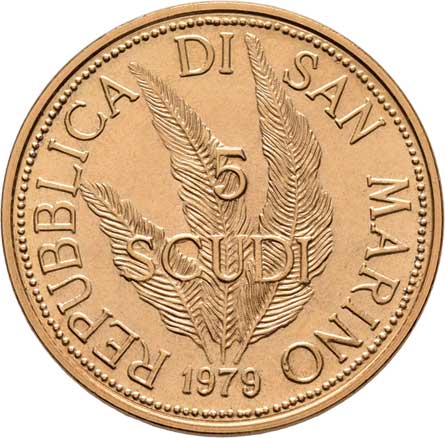| 222. | 5 Scudi 1979 - Mír - tři ruce, KM.101 (Au917, pouze