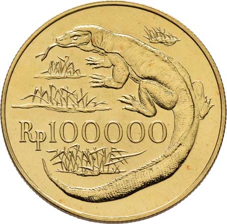 | 286. | 100.000 Rupie 1974 - varan komodský, KM.41 (Au900,