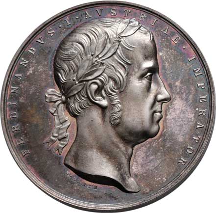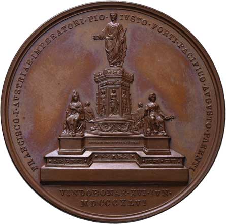 - portrét zprava, něm.opis/ čtyři alegorické postavy, opis a nápis, Sign., měď 70mm, 145.349g, dr.hr., pat. |
