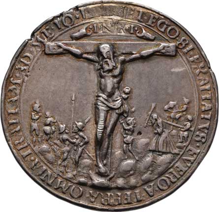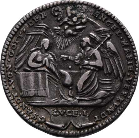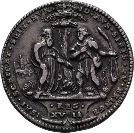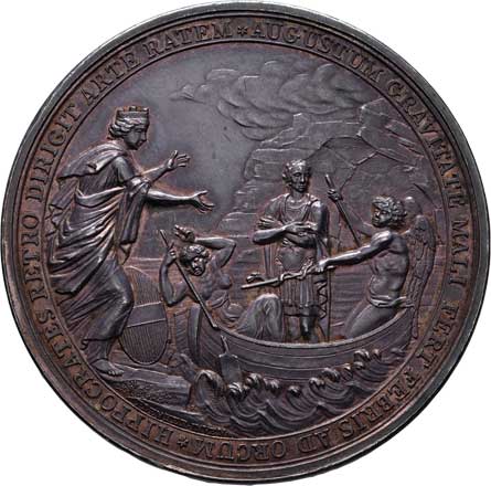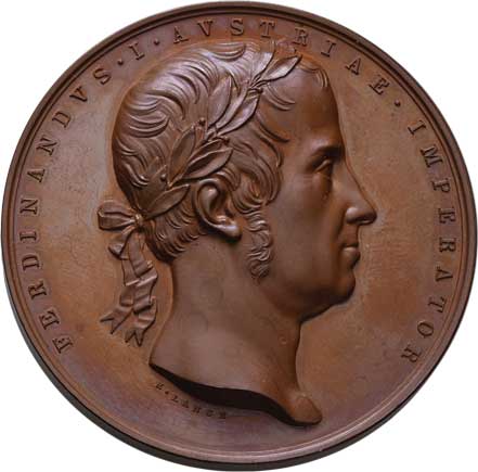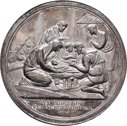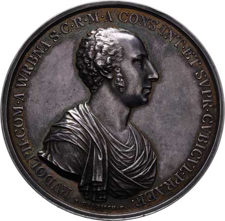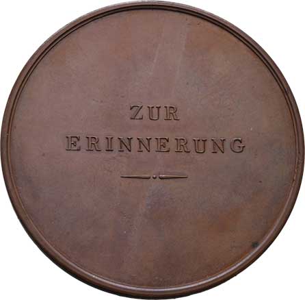 portrét zprava, němec. opis / tři alegorické postavy, opis a nápis, Sign., měď 70 mm, 130.816g, nep.hr. |
