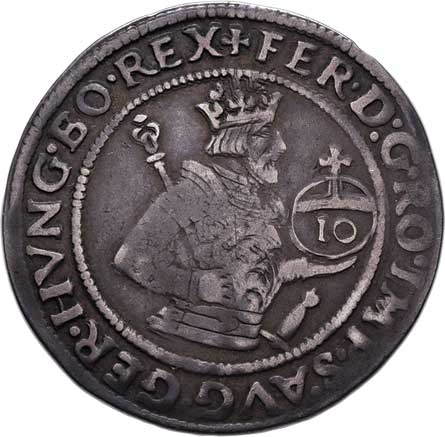 zleva, opis / číslice 10 ve věnci, 12mm, 1.270g, nep.rysky, pěkná patina, téměř |