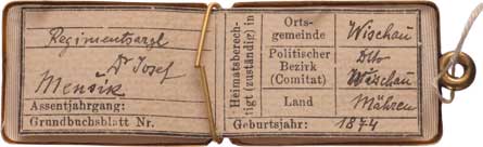 mosaz 34x51 mm, uvnitř osobní záznamy plukovního lékaře Josefa Menšíka, naroz. 1874 R! |