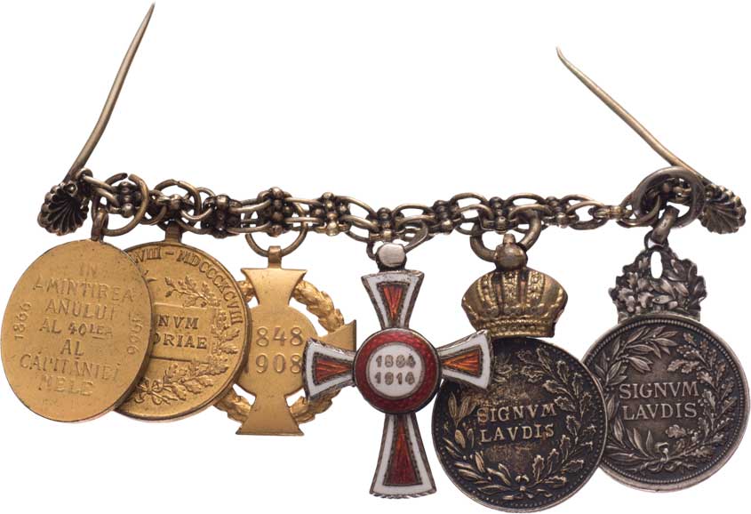 II.třídy, 2x Signum Laudis, Jubilejní kříž 1908, pamětní medaile 1898, rumunská medaile 40 let vlády |