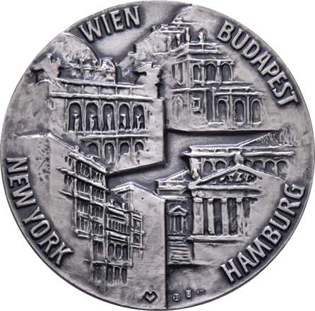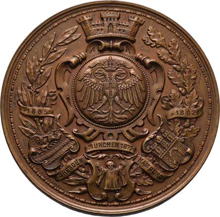 zakladatelů, něm. nápis / žena, kolonáda, vročení, Sign., patin. postř. bronz 40mm, 25.406g, pův. etue |