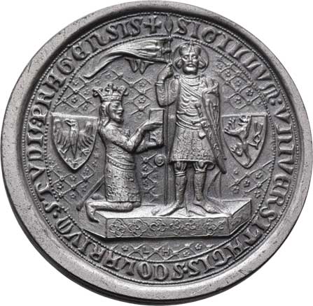 znaky, opis / panovník klečí před sv. Václavem, Karolinum, opisy, Sign., Punc., Ag900, 38mm, 24.360g |