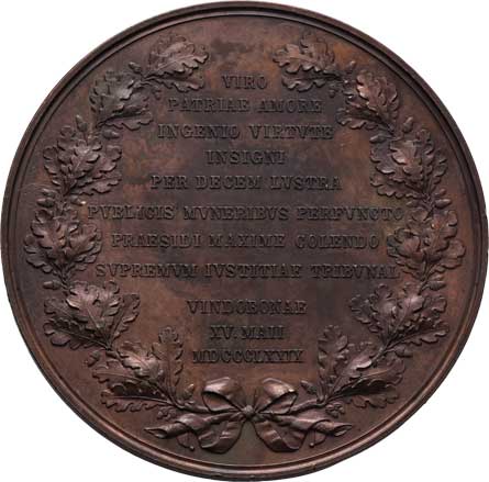 poprsí zleva, opis/ 11-řádkový nápis v dubovém věnci, Sign., bronz 67mm, 117.896g, Haus.7809, nep.hr., pat. |
