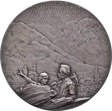 znakem, opis / horník a dítě, v pozadí město a hory, nápis, Sign., patin. Ag, 50mm, 44.878g, původní etue |