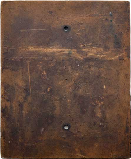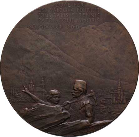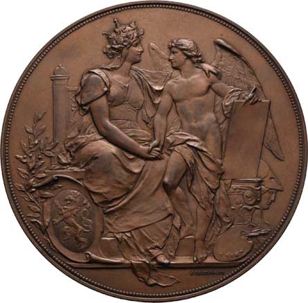 - dvě alegorické postavy, pohled na město, nápis, Sign., patinovaný bronz 58x72 mm, škr., skvrnky |