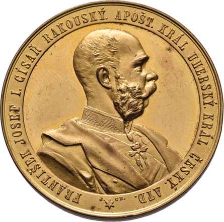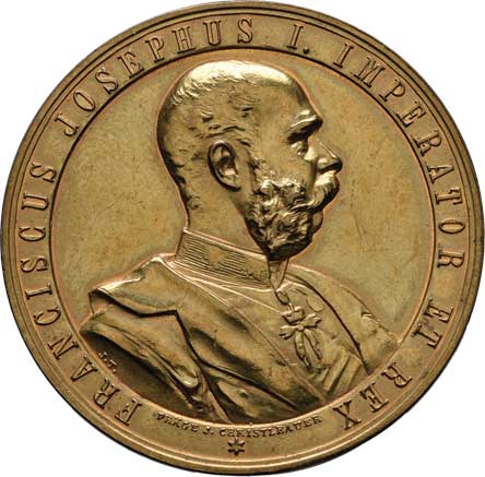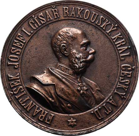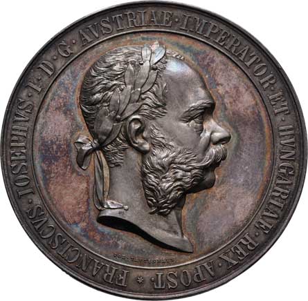 hlava Fr.Josefa zprava, opis / alegorie a dvojitý opis, Sign., bronz 57mm, 71.032g, ŠFP.1b, patina |