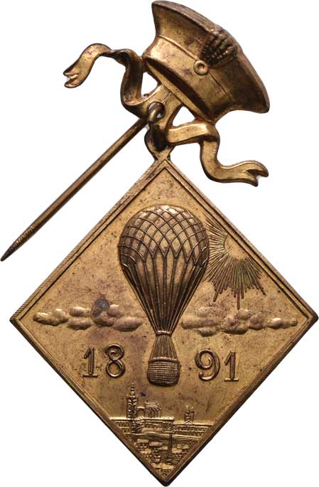 Prahou, 1891 / 7-řádkový něm. nápis a opis, Nesign., mosazná klipa 39x42 mm se závěs.jehlicí, ŠFP.65a RR! |