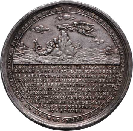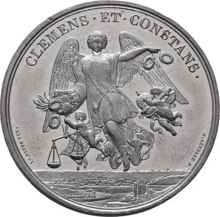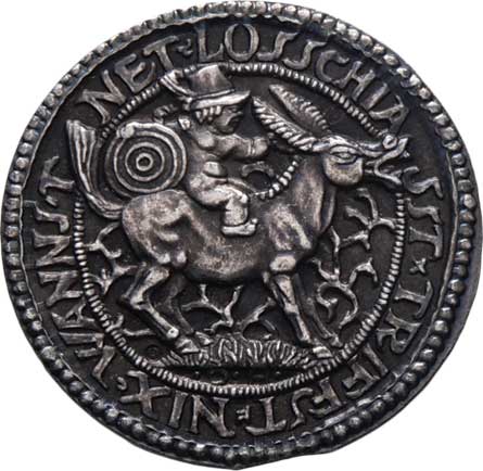 putti na oslu, terč, opis / vročení a 7-řádkový nápis ve věnci, Sign.OH, Nepunc., Ag 26mm, 5.863g, etue |