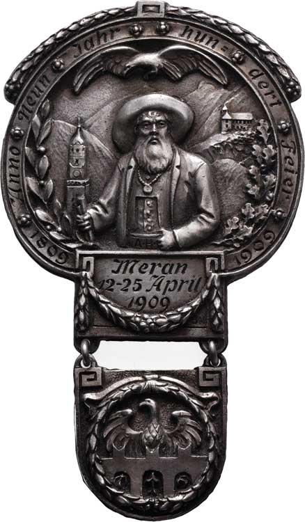 - portrét, nápis, znak Tyrol, znak města na přívěsku, Nepunc., Ag 40x47 mm, 26.453g, nálepka výr."Deschler" |