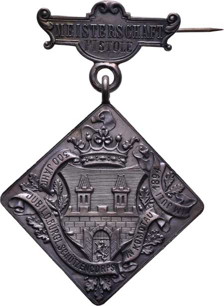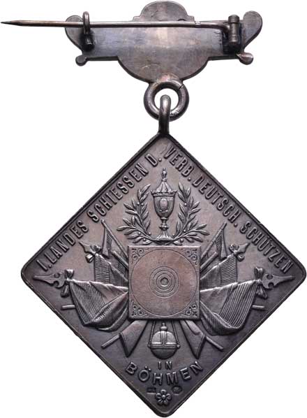 znak města, německý nápis / terč, pušky, prapory, pohár a opis, Nesign., Punc., 34x34 mm, 28.684g, etue |