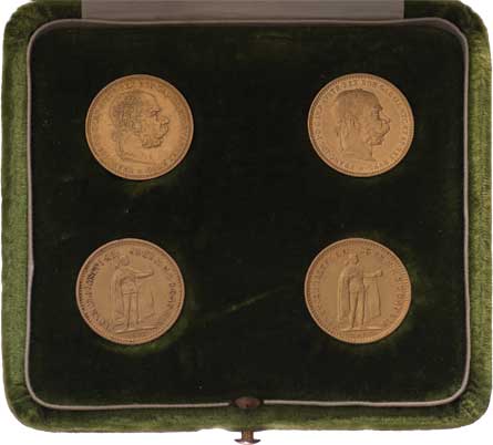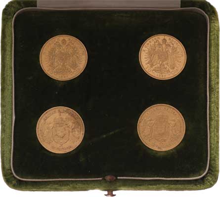 s věnováním a 4 rakouské desetikoruny, 1897, 1897, 1892 KB, 1894 KB, nep.hr., nep.rysky, patina RR! |