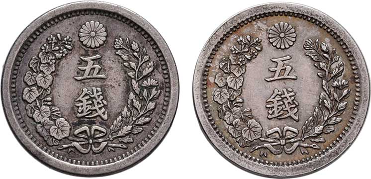 | 2585. | 5 Sen, rok 8 (= 1875), rok 10 (= 1877), Y.22 (Ag800),