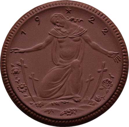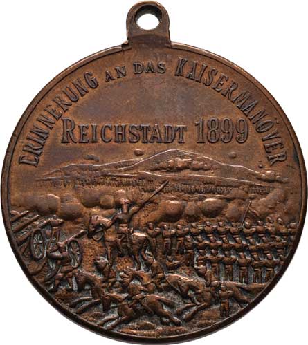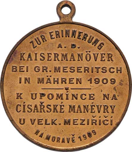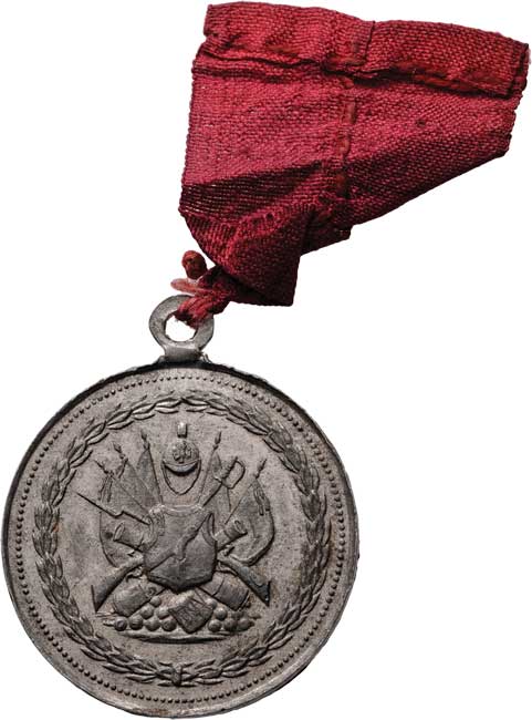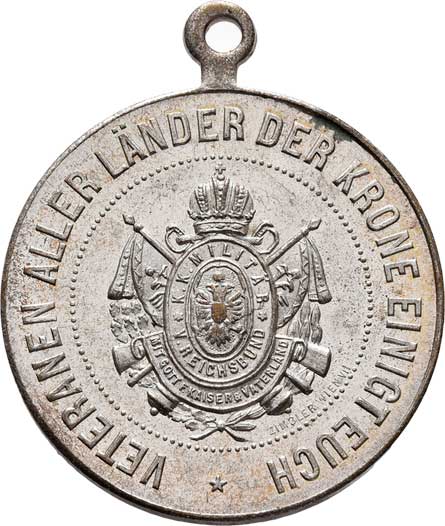 zbraně, zbroj a prapory ve věnci / 7-řádkový nápis ve věnci, Nesign., cín 29 mm s pův.ouškem a stužkou |