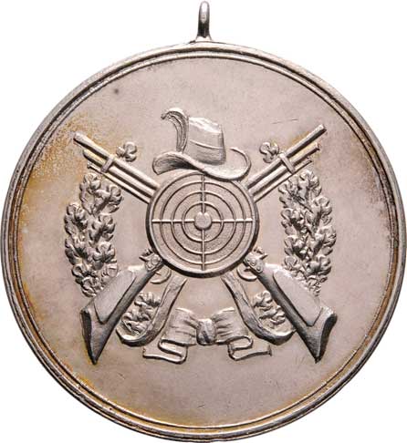 terč, pušky, klobouk a věnec / 3-řádkový rytý nápis ve věnci, Sign., Ag890, 36 mm s pův. ouškem, 23.801g |