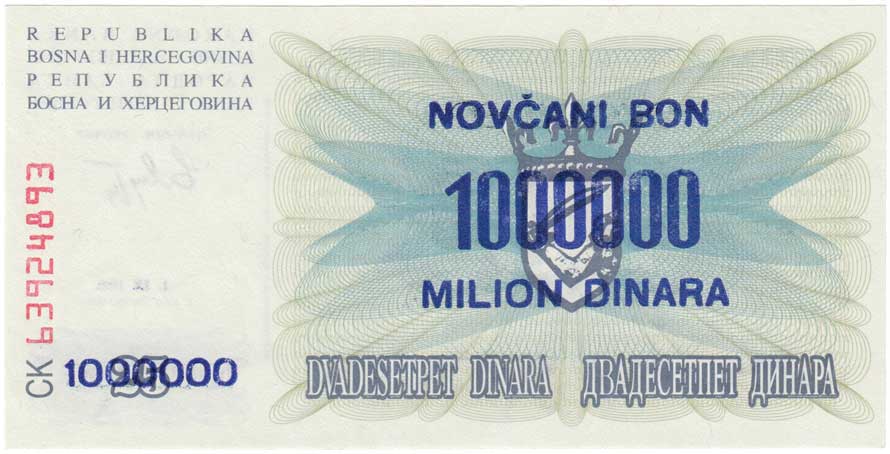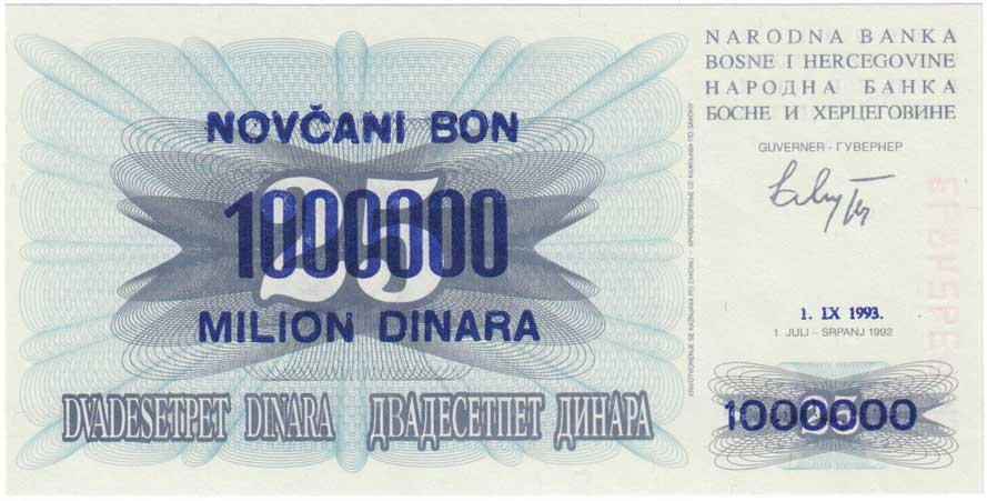 | 3409. | 1.000.000 Dinárů 1993, Pick.35c - nevydaný přetisk na