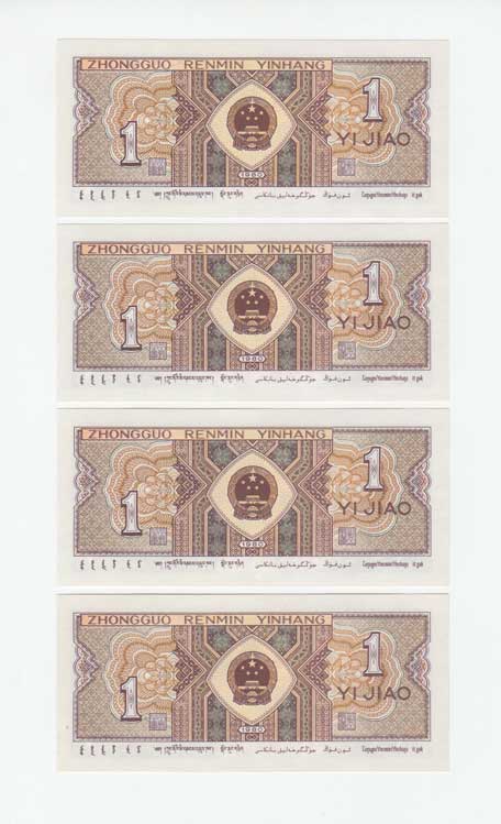 | 3415. | 1 Jiao 1980, Pick.881a, čtyři následující čísla | N | 30,- | 30,- |