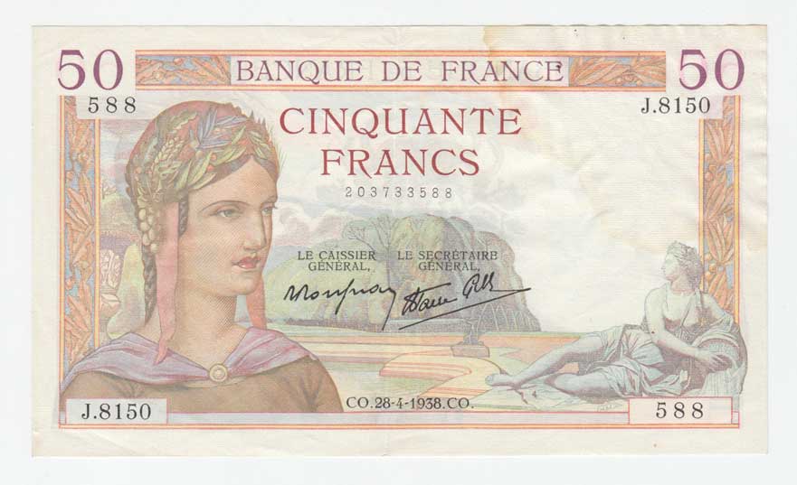 | 3428. | 50 Frank 28.4.1938, Pick.85b, skvrny | 1- | 80,- | 85,- |