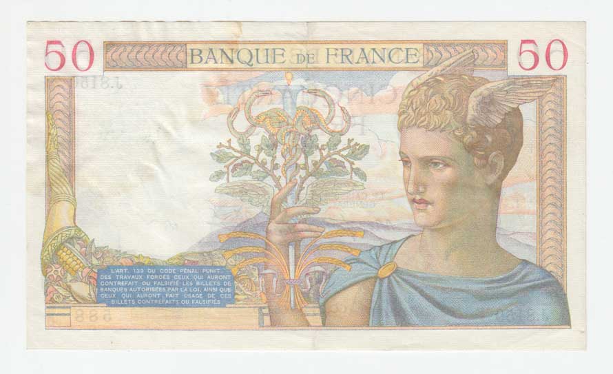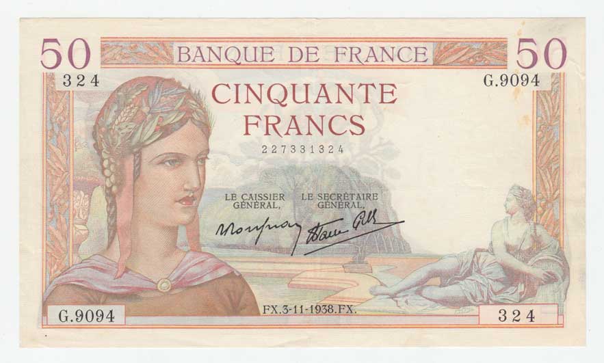 | 3429. | 50 Frank 3.11.1938, Pick.85b, nep.natrž. cca 5 mm | 2+ | 300,- | --.- |