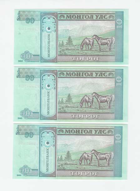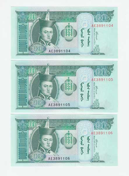 | 3498. | 10 Tugrik 2005, Pick.62c, tři následující čísla | N | 20,- | 20,- |