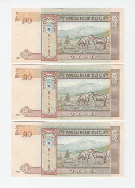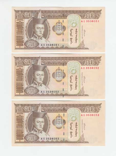 | 3500. | 50 Tugrik 2000, Pick.64a, tři následující čísla | N | 30,- | 30,- |