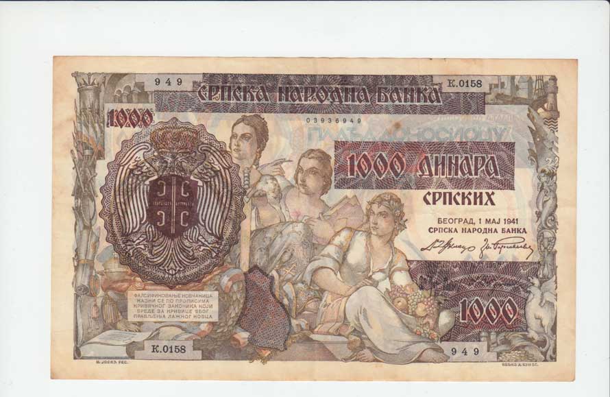 | 3724. | 1000 Dinárů 1941 - přetisk na 500 D., Pick.24, skvr. | 2- | 150,- | 150,- |