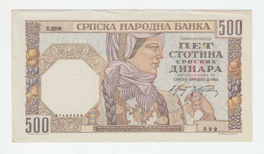 | 3725. | 500 Dinárů 1941, Pick.27b - vodotisk "hlava ženy