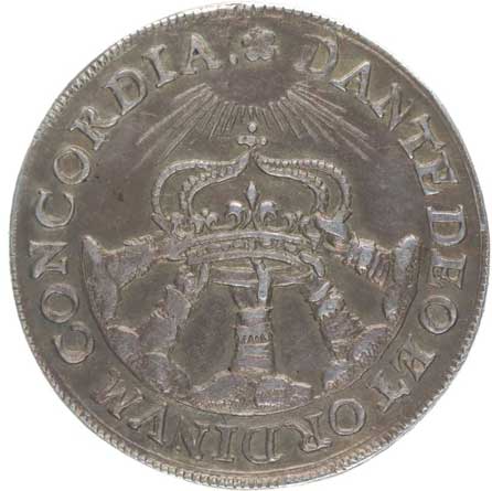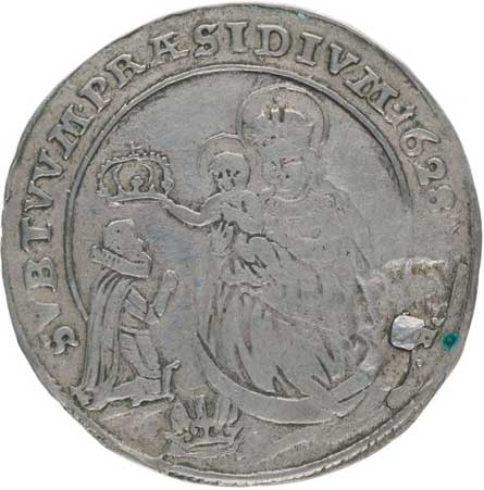 Výjev z bitvy, opis a nápis / Madona korunuje klečícího krále, opis, Ag 32 mm, 4,5 g, Mo.761 zaletov.dírka |