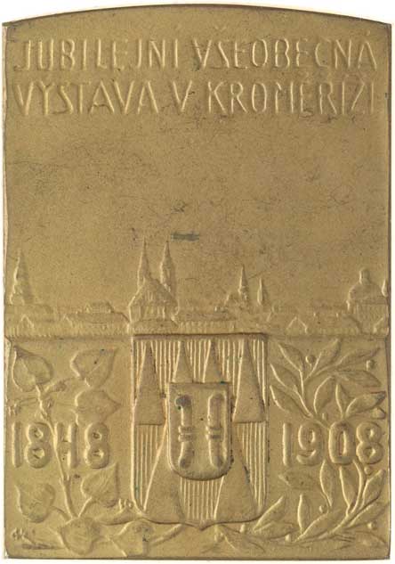 všeobecná výstava v Kroměříži 1848 - 1908, poprsí čelně nad výstavními atributy, 4řádk.nápis / pohled na město, pod ním znak a vročení Pozlac.bronz plaketa 37x52,5 mm, Haus.4102 |