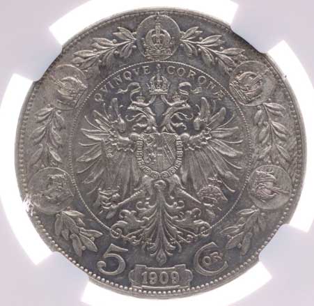 | 1205. | 5 Koruna 1909 b.zn. Schwartz, znač. NGC: MS60 | tém.0/0 | 2000,- | 2400,- |