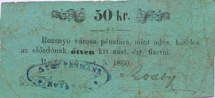 | 3401. | Rožňava (Rozsmyó) - 50 Krejcar 5.10.1860, bez čísla, s razítkem