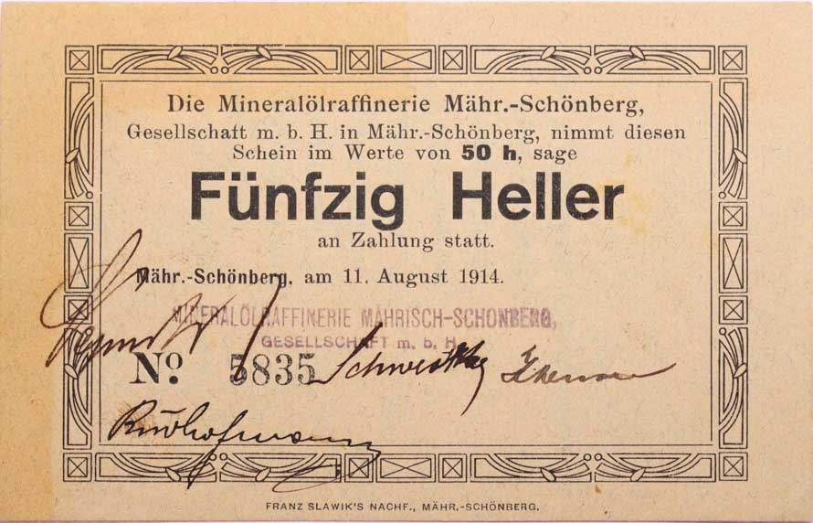 | 3407. | Šumperk (M.Schönberg) mineral.raf., 50 Heller 11.8.1914, č.9170