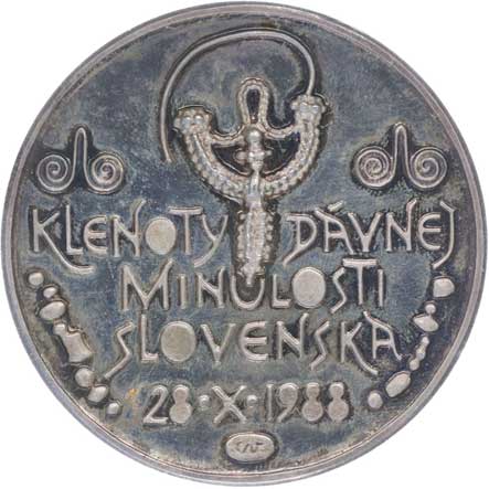 výstava Klenoty dávnej minulosti Slovenska 28.X.1989 s vystavenými předměty, Postř.medaile 60,5 mm, 101,93 g orig.etue s udělením Milošovi Jakešovi 24.10.1988 |