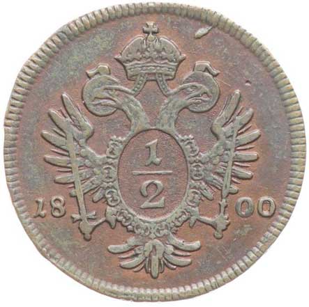 695. Cu 1/2 Krejcar 1800 A -1/1 220,- --.-