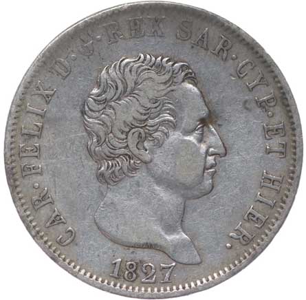 1300. 5 Lira 1827 P, Cr.105, KM.105.1 1/1 2800,- --.-