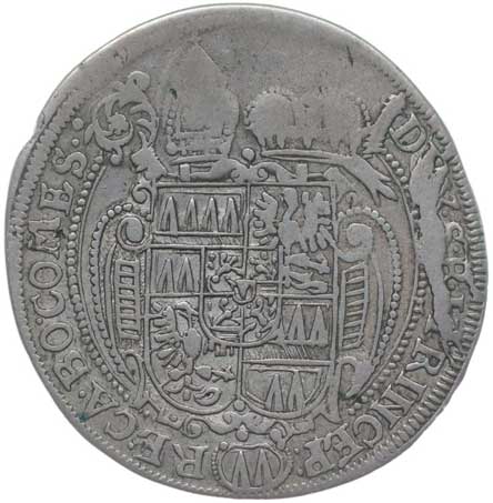 1633. Jarmareční suvenýr b.l., poprsí zprava, opis / velký rodový znak, opis