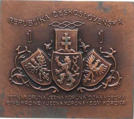 šest překrytých čs. mincí, opis / mincovní lis mezi symb. slunce