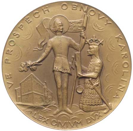 Znaky Prahy a ČSR, v pozadí univ.insigie, opis / klečící Karel IV.