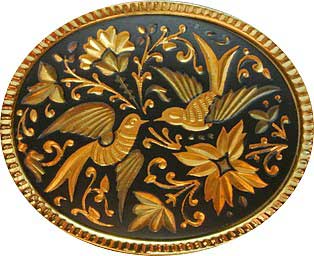 | 1329. | Ovál - gravírovaný zlacený šperk, na černém pozadí s ptáčky a rostlinnými
