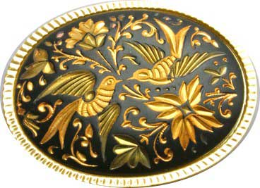 | 1379. | Ovál - gravírovaný zlacený šperk, na černém pozadí s ptáčky a rostlinnými