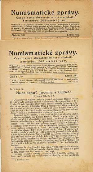 vyd. Museum v Netolicích 1948 8 stran + foto 2/ Chaura Karel: Nález denárů Jaromíra a Oldřicha (na Levém Hradc i) vyd. Numismatické zprávy roč. VIII. číslo 1. +2. 3 ks |