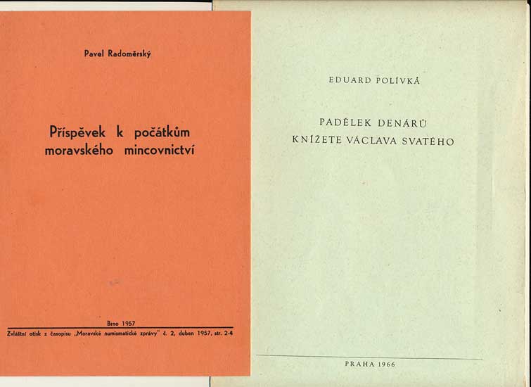 Kutné Hory 28 str. +příloha; 2/ Dtto: Příspěvek k počátkům morav ského mincovnictví vyd. Brno 1957 4 str.; 3/ Polívka Ed.: Pad ělek denárů knížete Václava vyd. Praha 1966 8 str.; 4/ Kudrna: Deníry vévody Jaromíra připisované Oldřichovi vyd. 1948 8 str. |
