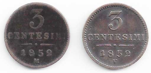 111. 3 Centesimi 1852 M, V, Nov.:92 2 ks -1 až 2- 60,- 170,-
