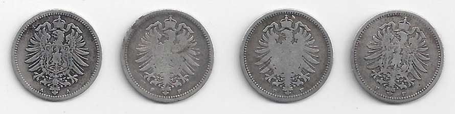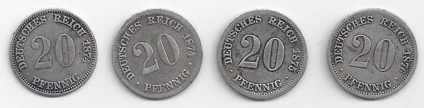 118. 20 Pfennig 1874 A, 1874 F, 1975 F, 1876 F, KM:5 -1 až 2- 50,- 220,-