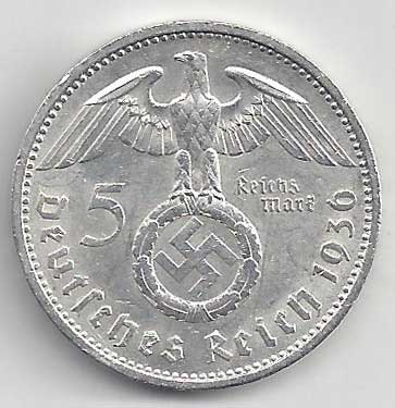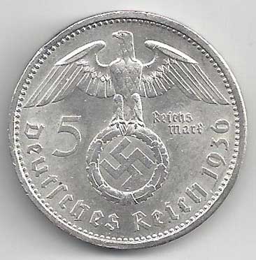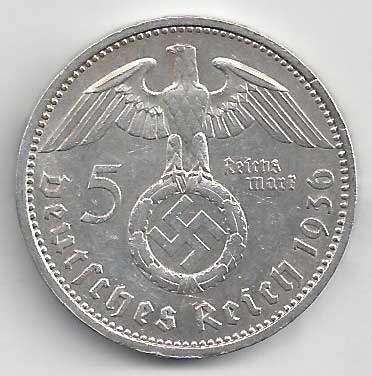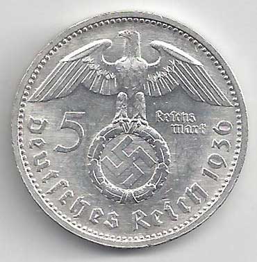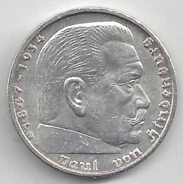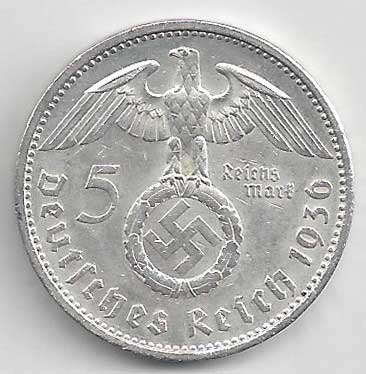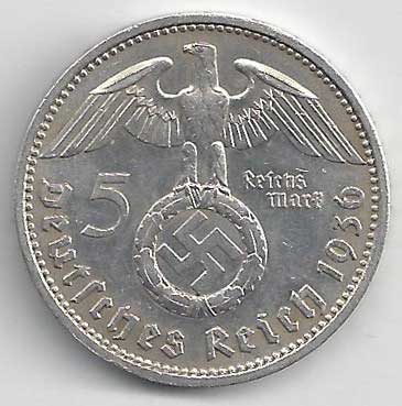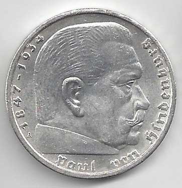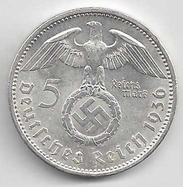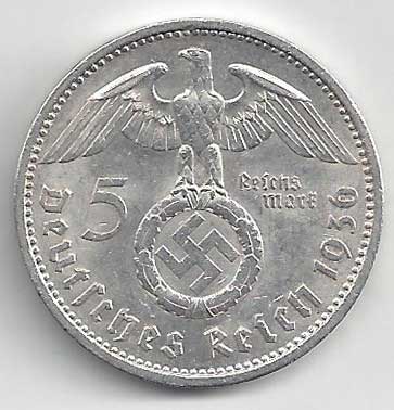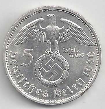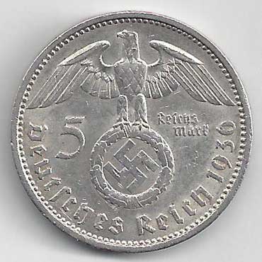 126. 5 Reichsmark 1936 A, KM:94 1/1 160,- 160,-