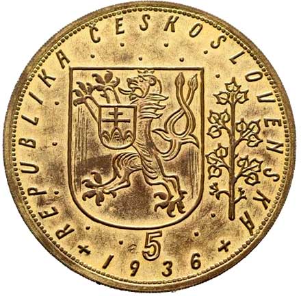 | 4. | 5 dukát 1936, zlacený odražek z obecného kovu, nad B-O.Š punc BRONZ,