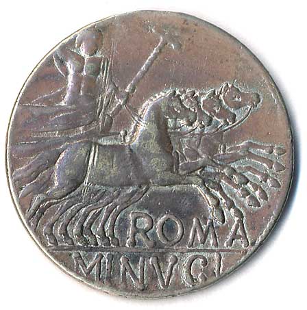 zvětšená napodobenina denáru z roku 133 př.Kr., Ag 35mm/13,8g, patina |