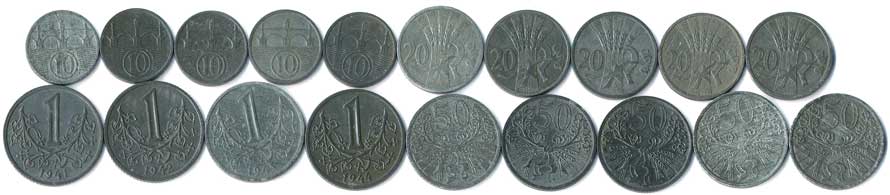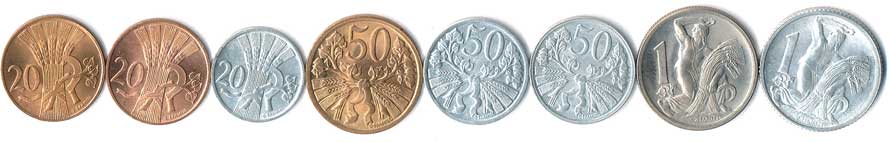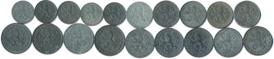 | 365. | 10,20,50 haléř, 1 Koruna, kompletní protektorátní série, celkem 19 mincí | 1-1- | 200,- | 500,- |